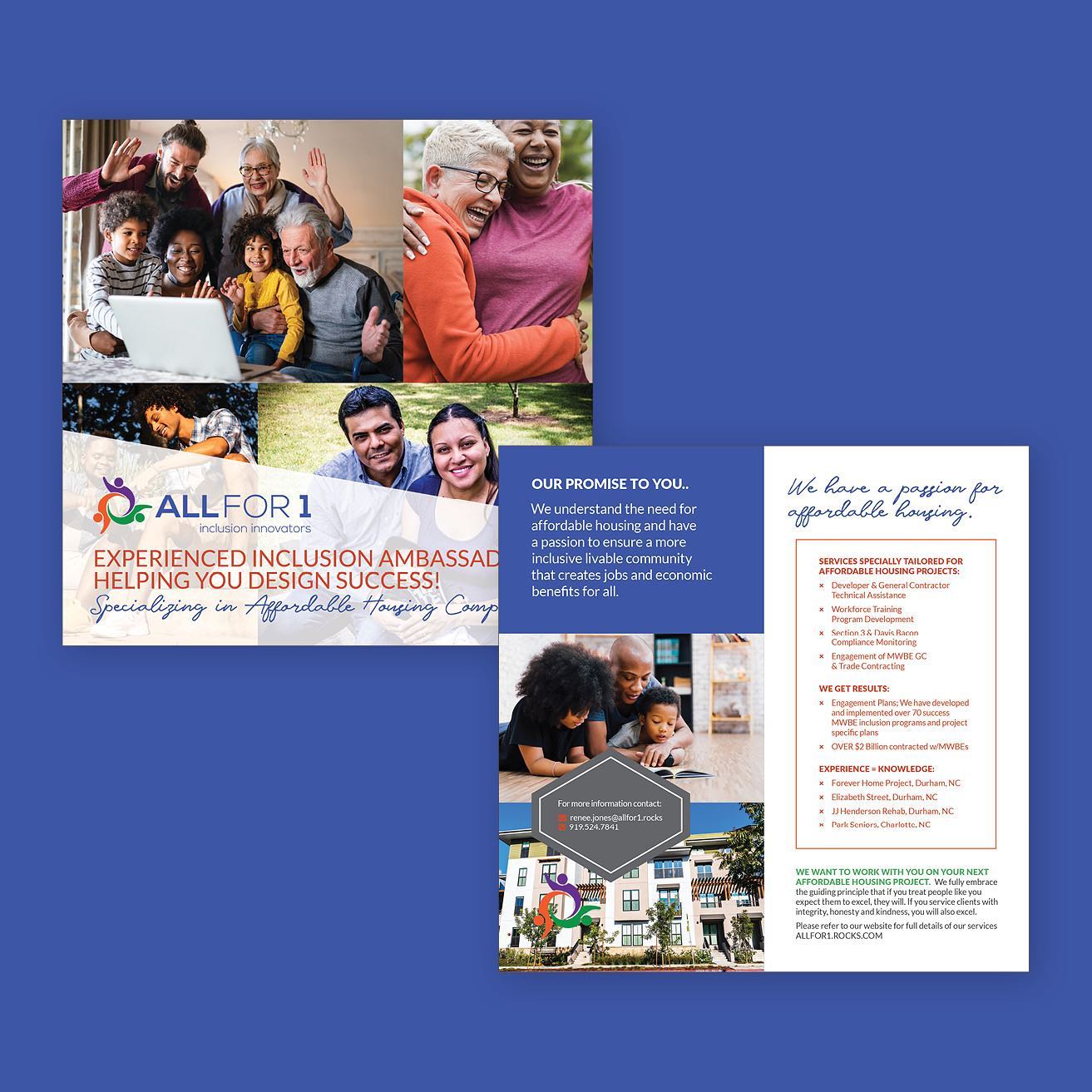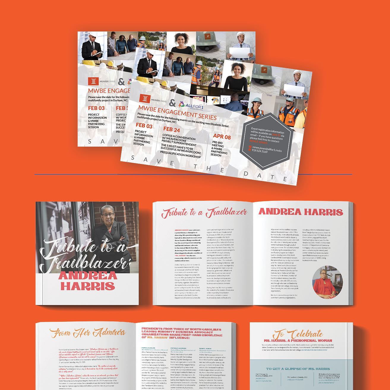 By Ellise Williams In HolidayWhen Reneé Jones of All for 1 reached out to us, she needed a partner to help her bring community-minded projects to life while growing her business through branded items. We created an overview brochure, save-the-dates for a new MWBE Engagement series hosted by All for 1, and a tribute to Andrea Harris. Swipe to see!