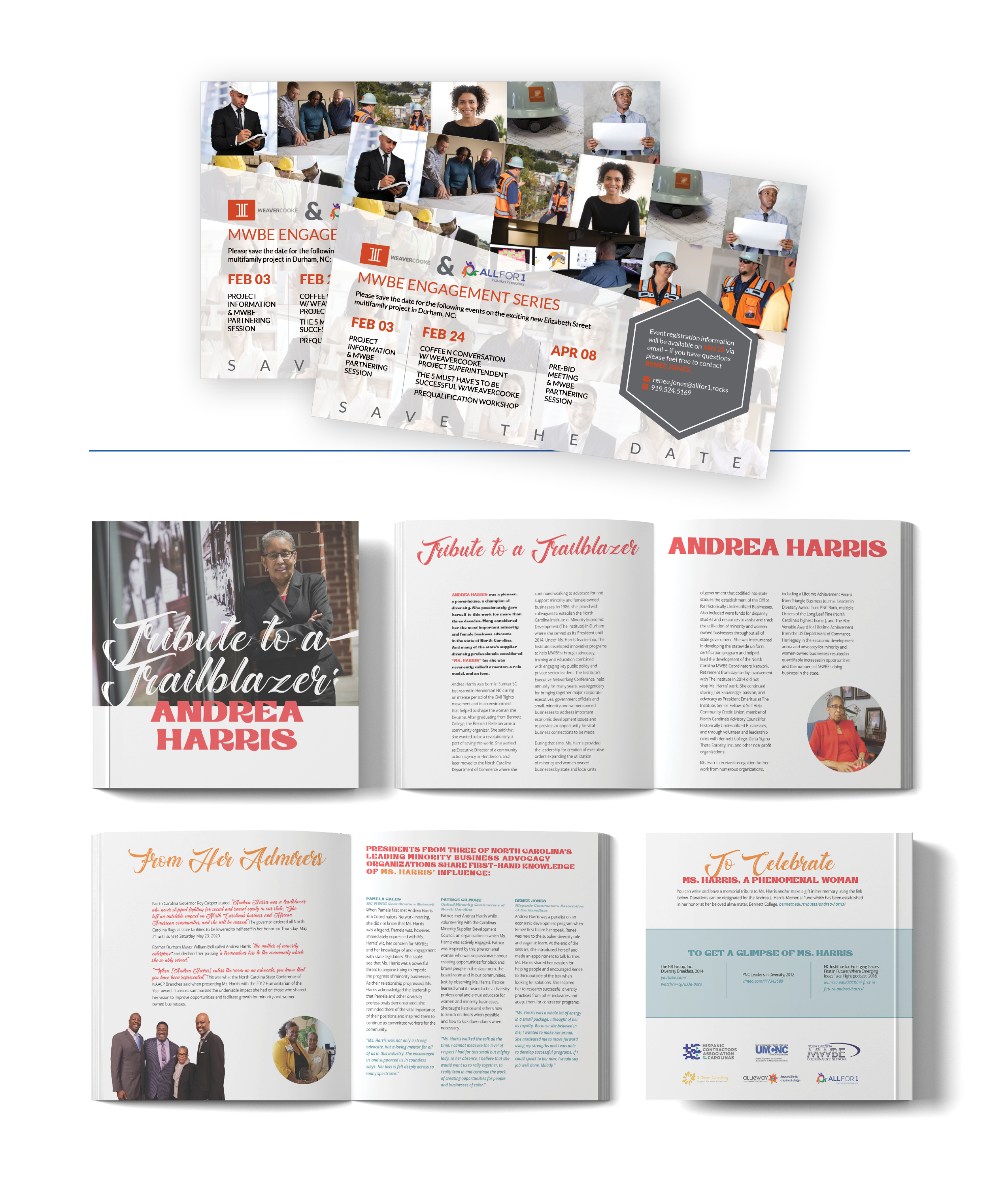 When Renee’ Jones of All for 1 reached out to Allieway Marketing, she needed a partner to help her bring to life her community-minded projects while growing her business through brand items. Allieway delivered save-the-dates for a new MWBE Engagement series hosted by All for 1. We also collaborated with All for 1 to create a tribute to Andrea Harris, a trail blazer, a pioneer, a powerhouse, and a champion of diversity who passed away in the spring of 2020. Many considered her the most important minority and female business advocate in the state of North Carolina. And many of the state’s supplier diversity professionals considered “Ms. Harris”, as she was reverently called, a mentor, a role model, and an icon. She passionately gave herself to this work for more than three decades.