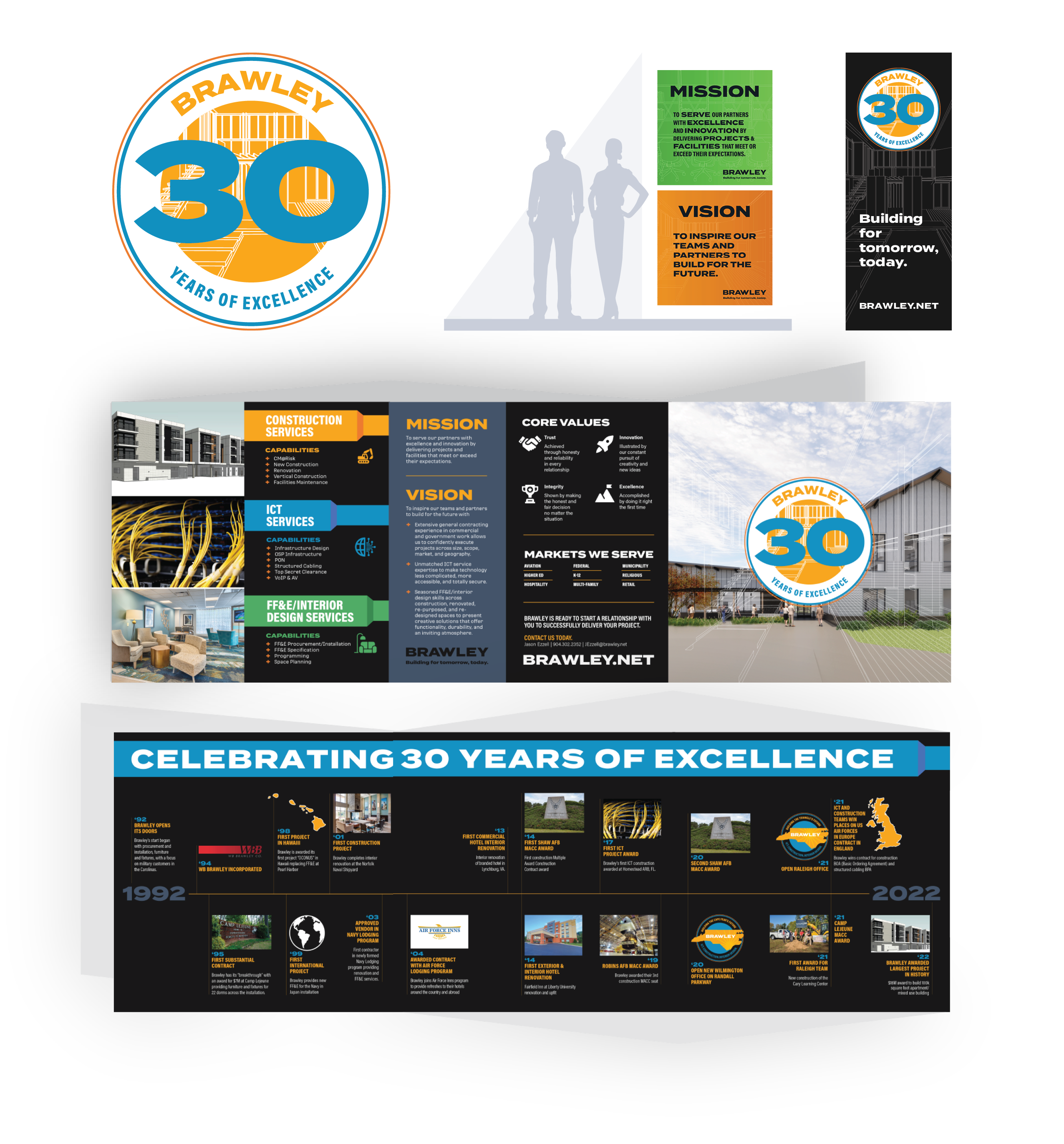 In 2022, the Brawley team celebrated 30 years. They enlisted the Allieway team to help them develop a campaign that celebrated the firm’s success and accomplishments to date and sets the stage for Brawley’s future. The year-long campaign theme was “30 Years of Excellence” and plays off the organization’s mission. It activated Brawley’s team, followers, and the broader community around its three service lines and the growth the firm has seen across North Carolina. It reinforced key messaging and provided an opportunity to celebrate. Allieway developed a timeline with key milestones, photos, and quotes. In addition to printed materials, interactive signage at Brawley’s office, regular social media posts, and a video compilation, the 30th campaign was also incorporated into digital ads, print ads, email signatures, and more.