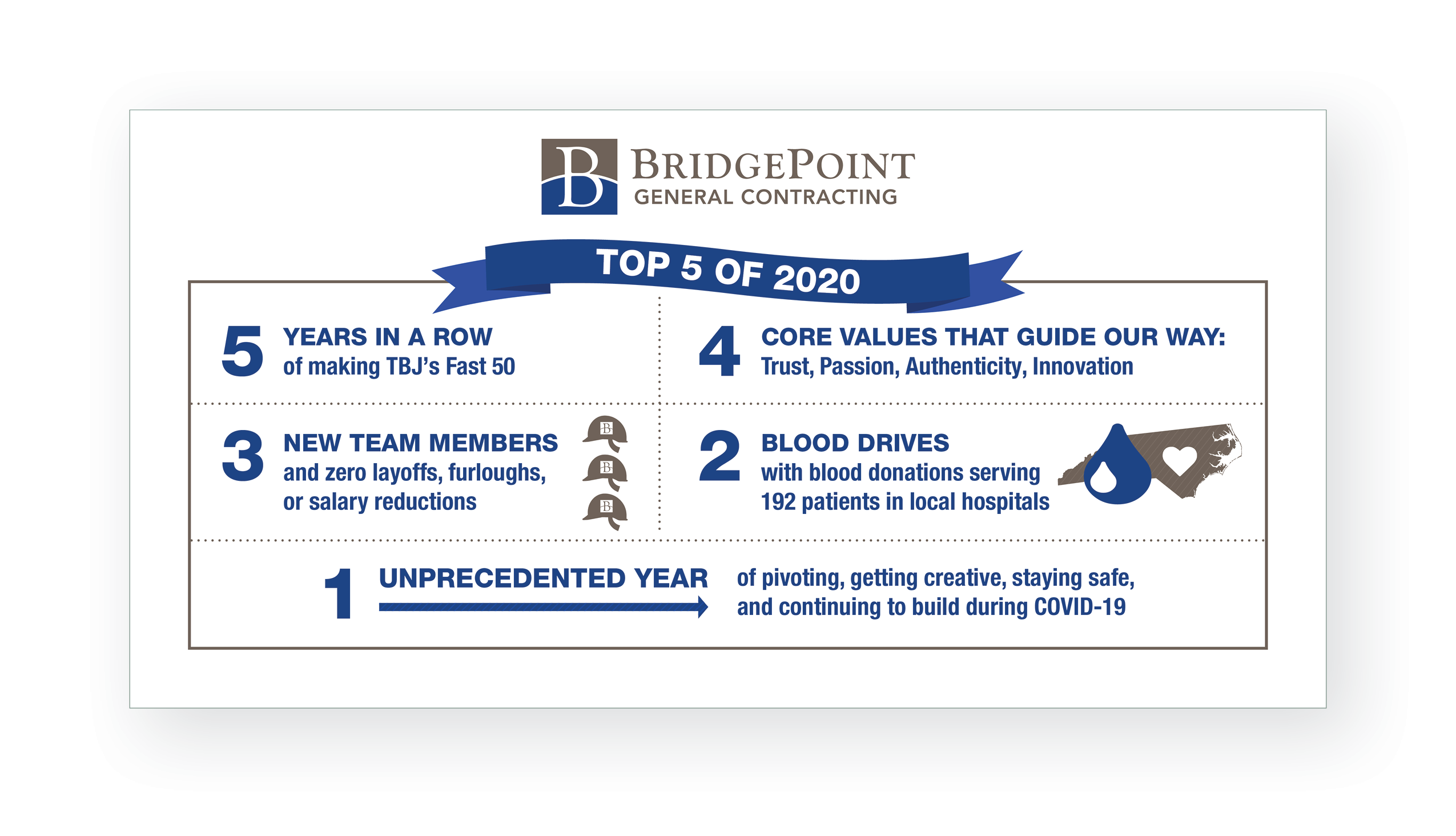 At the close of 2020, we helped BridgePoint General Contracting, one of Allieway’s longstanding clients, with a year-end review. The past year is one none of us will soon forget. Despite many challenges during the global pandemic, BridgePoint has a lot to remember and celebrate. The Top 5 of 2020 countdown we created for them highlights the company’s resolve, values, accomplishments, and commitment to the community. How will you and your business remember 2020? Creating Top 5 infographics like this are a great way to look back and project forward into a new year. They can be used as printed cards and brochures and shared online.Browse all BridgePoint work: