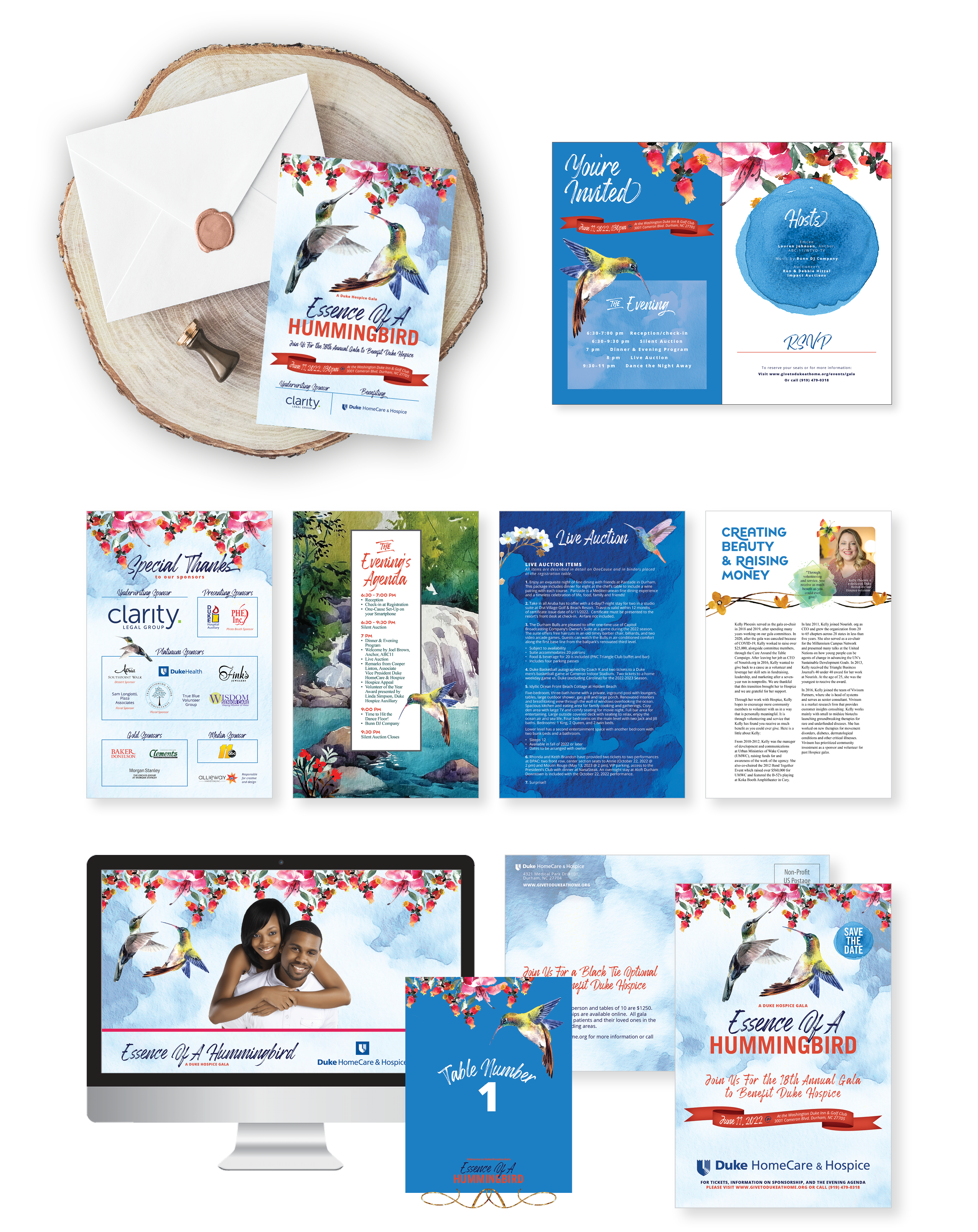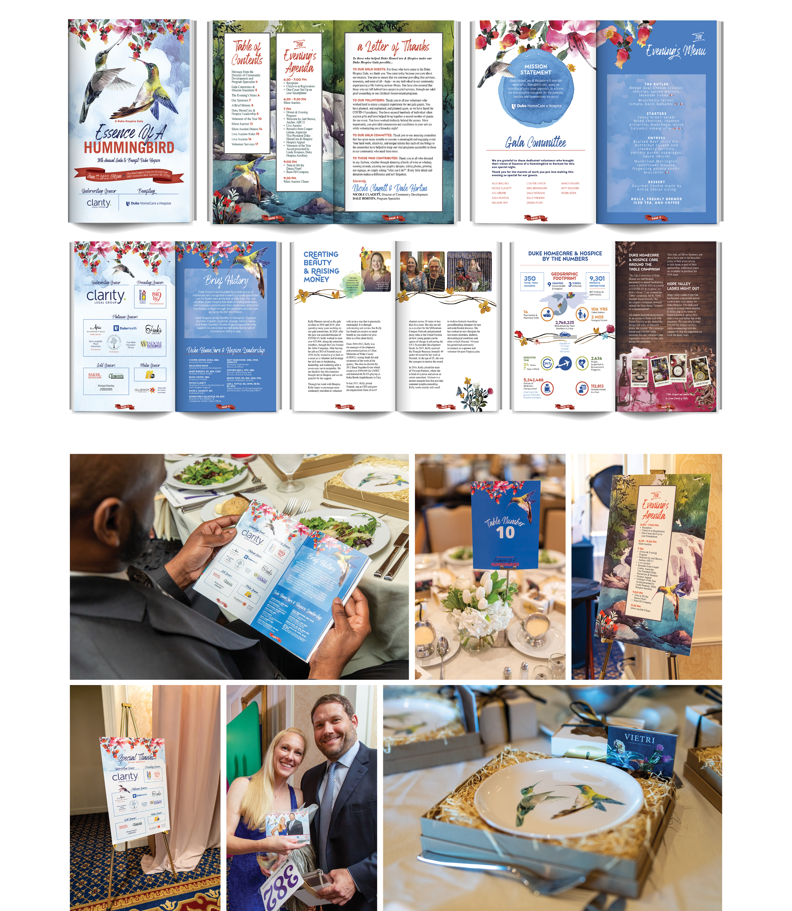 The 2022 Duke Hospice Gala was the most successful event to date, raising over $170,000 for innovative, thoughtful care for local patients and their families. For this year’s event, Allieway was in charge of developing the theme for the event. We also created the 36-page program, table signs, posters for sponsors and volunteer of the year, graphics for the photo booth, and the hummingbird design for the plates. This was the first in-person event since the COVID-19 pandemic hit, and we were proud to create engaging, memorable visual elements and print materials. Says Duke HomeCare & Hospice’s Nicole Clagett, “The program and signage really stood out bright!”