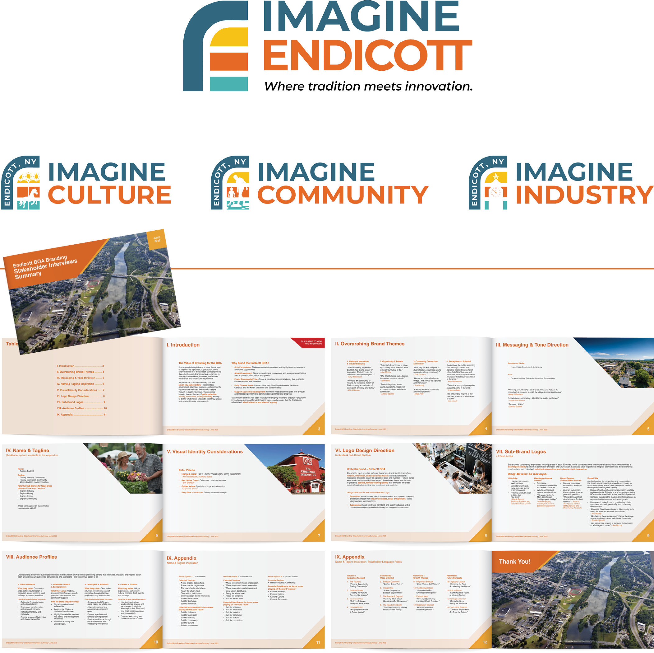 From naming and messaging to logo development and sub-brand strategy, we created a flexible identity system anchored by the new brand: Imagine Endicott. The tagline, Where tradition meets innovation, captures the unique balance of historic pride and forward-thinking energy that defines the community.
