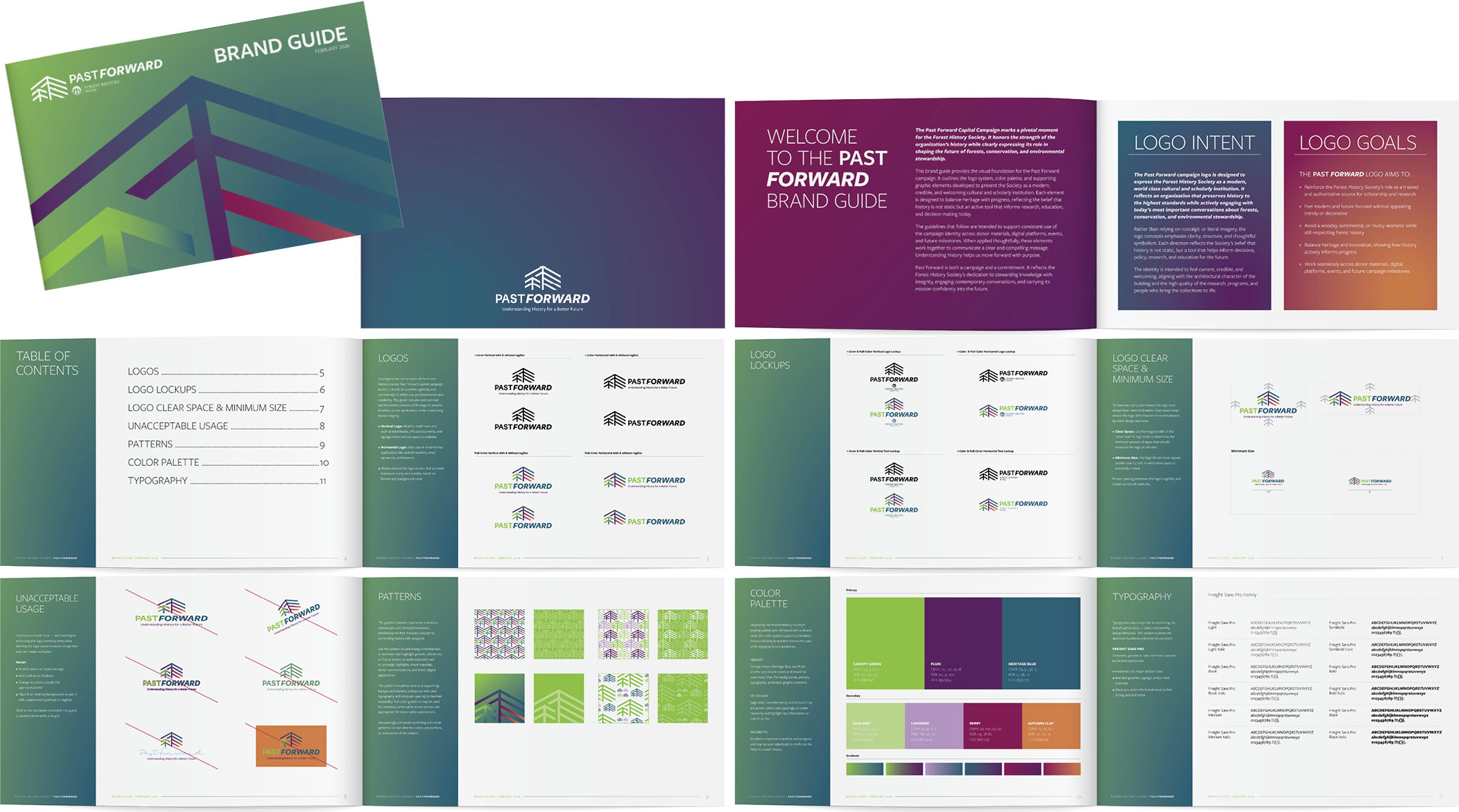 To ensure consistency and longevity, we created a comprehensive brand guide outlining logo usage, color palette, typography, patterns, and best practices. This guide equips the Forest History Society with a cohesive visual toolkit to confidently roll out the Past. Forward. campaign and carry the brand forward beyond the campaign.