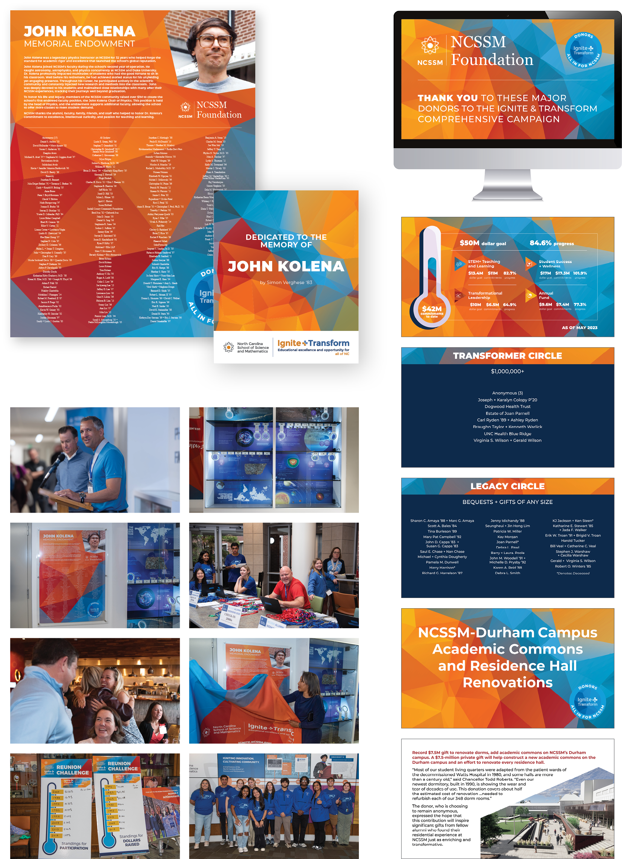 Other creative assets developed to reinforce NCSSM’s mission included launching their Foundation newsletter in a fresh format, updating print collateral, and designing the room dedication signage.