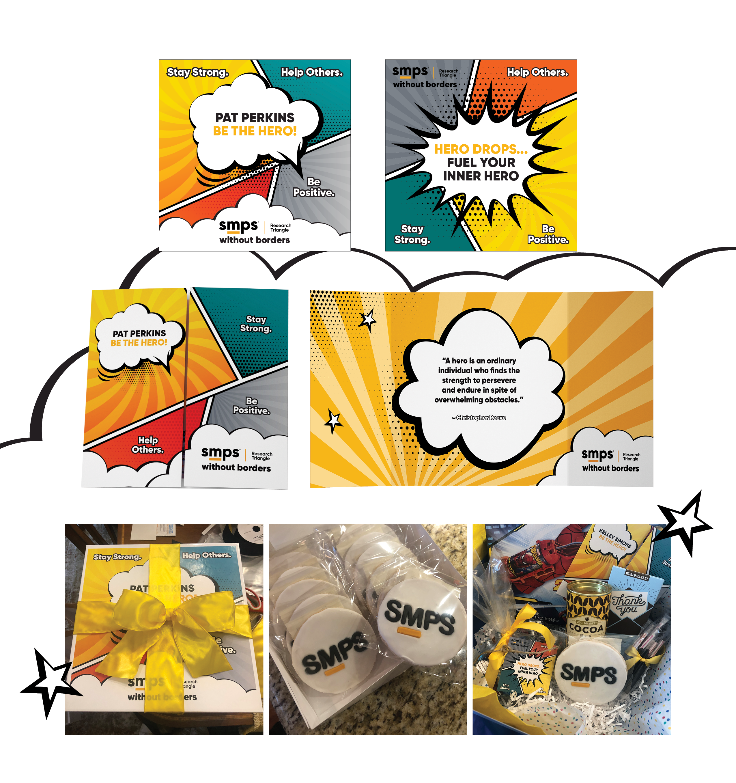 “I would highly recommend Allieway Marketing for branded, customized and creative solutions! As president of the SMPS Research Triangle Chapter it is my responsibility to plan and run our board meetings and milestone retreats. In this pandemic time we have only been able to meet virtually. For the mid-year planning retreat in January, I wanted to do something fun for the board. I immediately thought of Allieway Marketing to help me! Allie brainstormed three potential themes for SMPS RT-branded mystery boxes. I decided on “Be the Hero” and Allie and her team took it from there – crafting custom boxes with personalized labels, delivered in a beautiful super-size gift bag and filled to overflowing with fun superhero items. Each of us received a custom tri-fold brochure with a quote about what “hero” means. To top it off, Allie’s team hand-delivered the gift bags. We opened as a team at the start of the retreat and the SpiderMan webslinger, a variety of chocolates, custom-made SMPS branded cookies, and other fun items were all well-received!