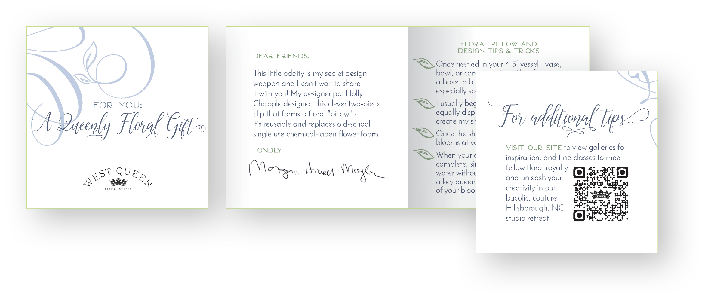 Allieway recommended leaning into Morgan’s artistic flair and subject matter expertise by combining floral design tips and education with a unique “floral pillow” design tool. We suggested fabric wraps to bundle the pillows with tie-on tags. The tag copy extended recent branding deliverables including a strong typographic voice with beautiful textured background vine flourishes. We included how-to tips and a QR code directing customers to the West Queen Studio website to get more floral design tips, sign up for classes, and view Morgan’s design galleries.